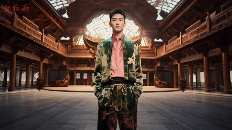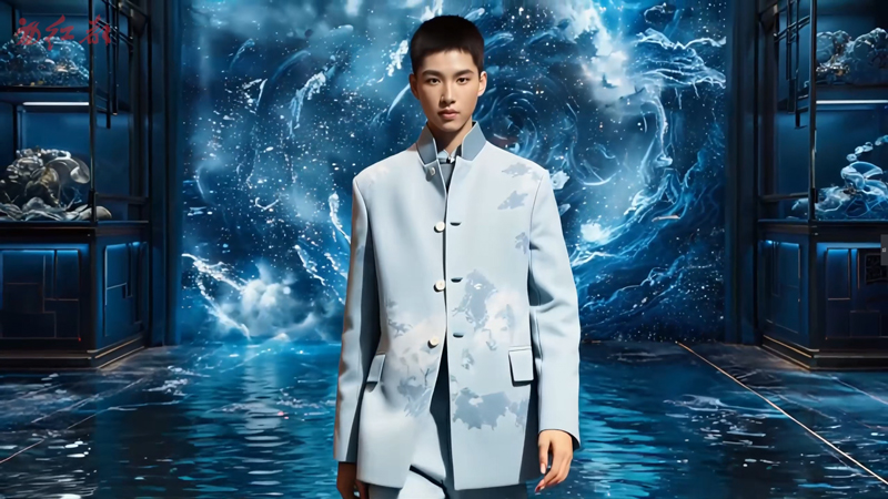 本次虚拟时装秀以数字技术重构非遗工艺模式。依托CLO3D与生成式AI技术,实现了全链路的数字化创新。在技术实现层面,设计团队运用CLO3D设计款式进行精细建模,模拟材质特性和图案工艺特性。AI生成式设计引擎则深度介入创意阶段。虚拟视频制作环节采用多模态AI协同框架,配合CLO3D的Motion Library动作捕捉数据库,构建出具有物理准确性的织物动态响应。